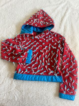 ✨ Jersey original Cyberdog (Camden Town, Londres) ✨ Jersey muy original y difícil de encontrar, comprado en la mítica tienda Cyberdog de Camden Town (Londres). Se trata de un modelo descatalogado, ya no existe en tienda, ideal para amantes de la moda alternativa, cyberpunk o piezas únicas. 🔴 Color: rojo butano 🧶 Detalles: salientes de lana en azul celeste y blanco, que le dan un diseño llamativo y diferente 👕 Talla: S 📏 Medidas: • Ancho de hombros: 38 cm • Largo: 45 cm ✨ Estado: muy bien cuidado, en excelente condición. 🔥 Estilo: súper original, imposible pasar desapercibida. Una prenda especial para quien busca algo distinto