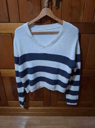 Precioso jersey a rayas en morado y blanco, ideal para cualquier ocasión. Es de manga larga y tiene un corte entallado. - Diseño de rayas marineras. - Tejido suave y agradable al tacto. - Perfecto estado.