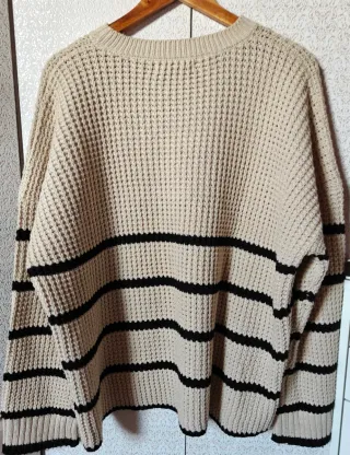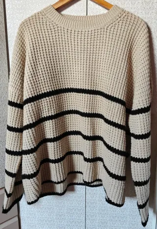 Preciosa y elegante jersey de la marca JANINA, en talla XL. Es de color blanco y negro a rayas. - Diseño de punto calado. - Manga larga. - Corte amplio y cómodo.