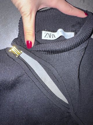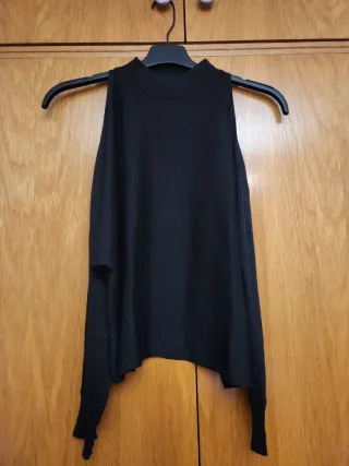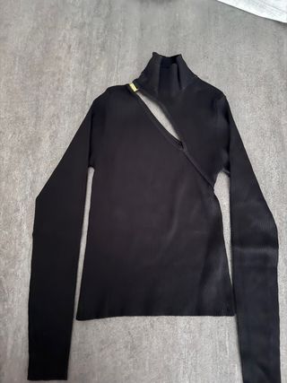 Jersey de manga larga con un diseño moderno y elegante. - Cuello alto. - Abertura asimétrica en el escote. - Detalle metálico dorado en el hombro. - Tejido acanalado. Usado una vez