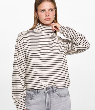 Jersey de Mango con cuello alto y estampado de rayas. - Diseño de rayas finas. - Manga larga. - Tejido suave y cómodo.