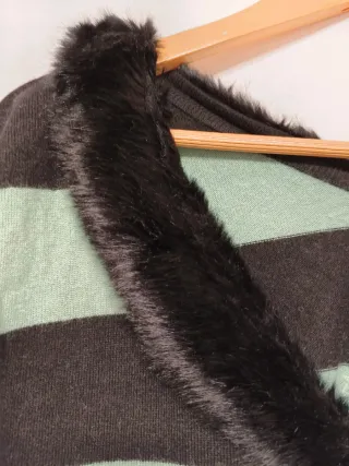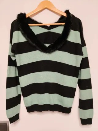 Jersey de punto con cuello en V y detalle de pelo sintético en el cuello. - Diseño de rayas horizontales en color negro y menta - Manga larga. - Acabado suave.