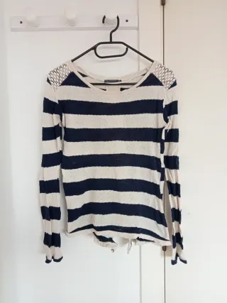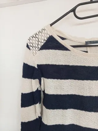 Jersey de manga larga con rayas marineras. Tiene detalles de encaje en los hombros y se anuda en la parte trasera. - Diseño de rayas marineras. - Encaje en hombros. - Cierre trasero con lazada.