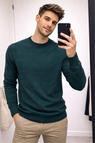 Jersey de punto fino con cuello redondo. - Manga larga. - Tejido suave y cómodo. - Primark. - Sin coderas. - Color aguamarina / verde azulado / azul verdoso. - como se ve en las imágenes. - Primera imagen modelo generada con IA.
