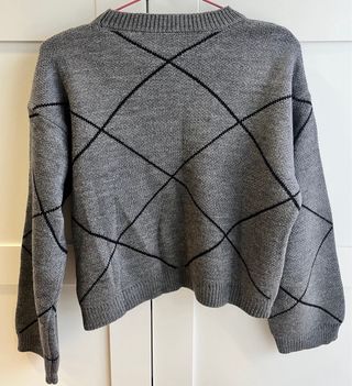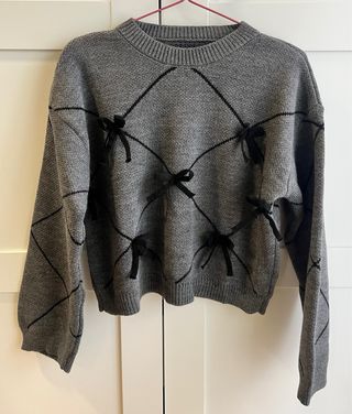 Jersey de punto gris con un diseño de rombos y pequeños lazos negros. - Cuello redondo. - Manga larga. - Tejido suave y cómodo.