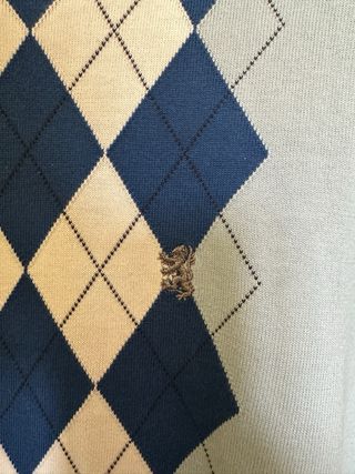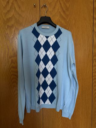 Jersey fino de punto con un diseño clásico de rombos en la parte delantera. - Cuello redondo. - Manga larga. - Diseño de rombos en azul marino, azul claro y blanco. Probado un solo día. Está nuevo