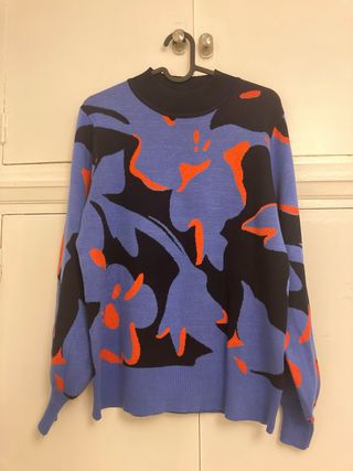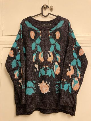 Jersey oversize de Zara con un llamativo estampado floral. - Diseño holgado y cómodo. - Tejido con hilo brillante. - Mangas largas. - Cuello redondo. Precio negociable