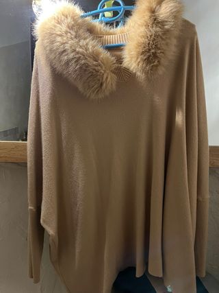 Jersey elegante tipo capa en color beige/camel, muy calentito y cómodo. Tiene cuello amplio con detalle de pelo sintético, que le da un toque sofisticado y especial. Tejido suave, con caída fluida y corte holgado, favorecedor para todo tipo de cuerpos. Mangas largas con puños acanalados. Ideal para looks de invierno, tanto informales como más arreglados. Muy fácil de combinar con pantalones ajustados, leggings o botas.