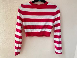 Jersey de manga larga con un diseño de rayas horizontales en blanco y rosa. Es una prenda de punto con un corte moderno. - Diseño de rayas. - Manga larga. - Queda corto Usado pero en buen estado