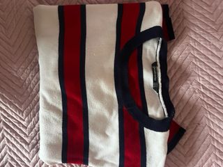 Jersey de manga larga con un diseño de rayas horizontales. - 100% algodón. - Combinación de azul marino, verde oliva y blanco. - Cuello redondo. - Talla L. - No tiene ningún defecto ni marca de uso. - Usado muy pocas veces.