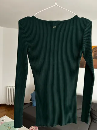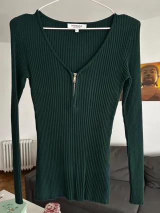 Jersey,camiseta verde de punto fino, manga larga con cuello en V y cremallera,acanalado, ajustado.Como nuevo, se ha puesto una sola vez