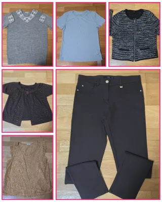 El lote consta de 6 prendas, todas están en muy buen estado ; -Pantalon marrón talla Yera talla 38,es elástico: cintura 37 cm y largo 94 cm -Camiseta azul con etiqueta Emery Rosa,talla M : sisa a sisa 49 cm y largo 64 cm -Jersey gris cuello pico talla M ;sisa a sisa 50 cm y largo 64 cm -Chaqueta negra y blanca de H&M talla M: sisa a sisa 47 cm y largo 61 cm -Bolero marrón talla única: sisa a sisa 47 cm y largo 49 cm -Camiseta mostaza (más fuerte que en las fotos ) talla única: sisa a sisa 50 cm y largo 64 cm TE INVITO A VISITAR MISEGUNDON PERFIL. UNE TODOS LOS ARTÍCULOS QUE TE GUSTEN Y PAGA UN SOLO ENVÍO