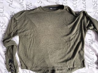 Jersey de punto en color verde, con un diseño crop que lo hace moderno y versátil. - Tejido suave y agradable al tacto. - Manga larga. - Cuello redondo.