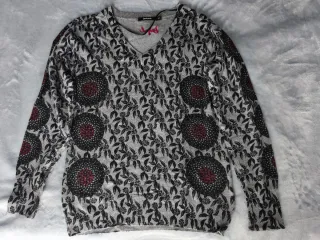 Jersey de manga larga con un estampado floral y detalles circulares en tonos rojos y negros sobre fondo gris. Cuello en pico. - Diseño original de Desigual. - Tejido suave y cómodo.