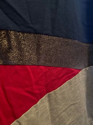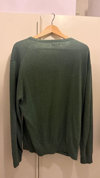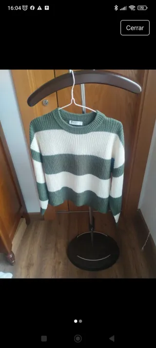 Jersey de punto color caqui con hilos dorados. Es talla única, pero lo aconsejaría para personas que utilicen la talla XS o la S. La manga no es demasiado larga, por lo que a mi personalmente me gusta para llevarla en modo 3/4.