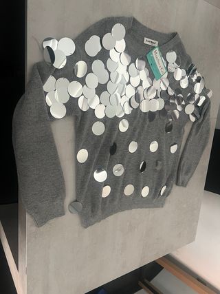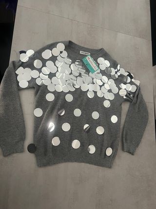 Jersey de punto gris con un diseño llamativo de grandes lentejuelas plateadas. - Lentejuelas circulares. - Diseño moderno y brillante.