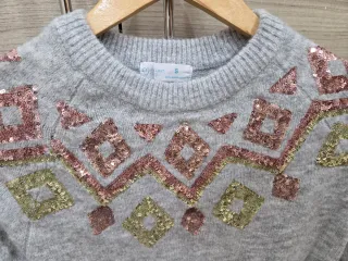 Jersey de punto gris con un diseño de lentejuelas multicolor en la parte superior. - Cuello a la caja. - Manga larga. - Detalle de lentejuelas brillantes.