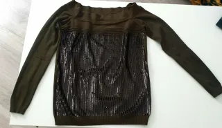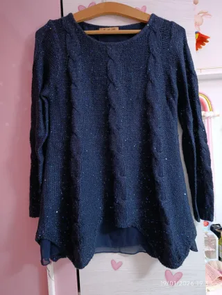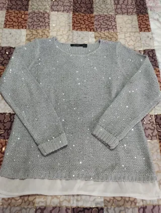 Jersey de punto con un diseño brillante y elegante. La parte inferior tiene un detalle de tela blanca que le da un toque de capa. Talla S - Manga larga. - Cuello redondo. - Adornado con pequeñas lentejuelas plateadas.