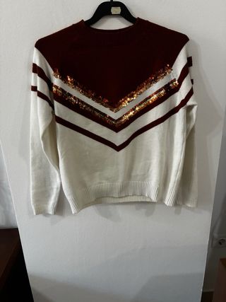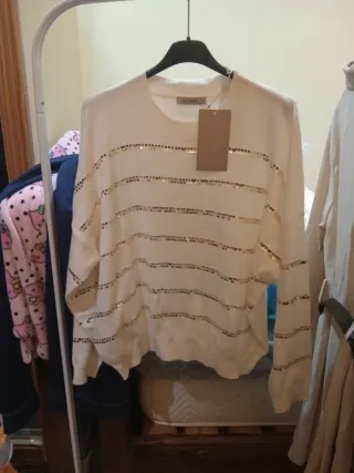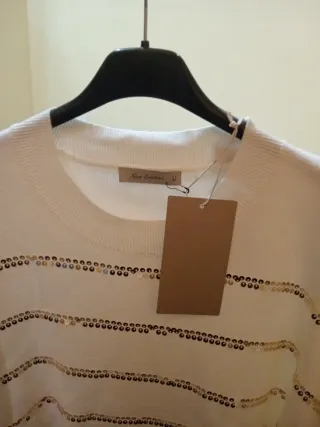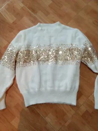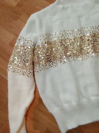 Jersey blanco con un diseño de lentejuelas doradas en la zona del pecho y las mangas. Es una prenda llamativa y elegante. Nuevo - Tejido suave y confortable. - Detalle de lentejuelas brillantes.