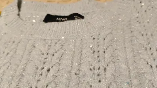 Jersey de MNG en color plateado, con un diseño brillante y detalles de lentejuelas que le dan un toque especial. Solo se ha utilizado una vez, por lo que se encuentra en perfecto estado. - Tejido con hilo brillante. - Detalle de lentejuelas. - Diseño de punto calado.
