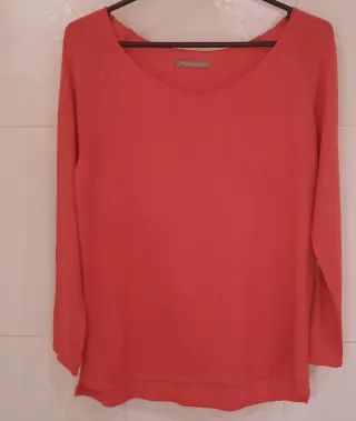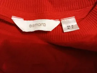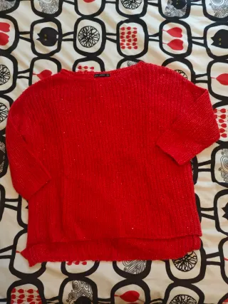 Jersey de punto fino en color rojo de Zara. Tiene un diseño moderno y es muy cómodo. - Tejido con hilo brillante y mini lentejuelas. - Manga tres cuartos. - Bajo asimétrico con aperturas laterales.