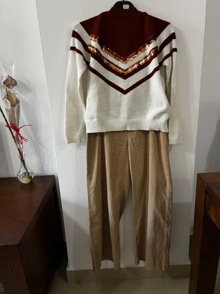 Conjunto de pantalón ancho y jersey con detalles de lentejuelas. - Jersey de cuello alto con diseño en V con Lentejuelas doradas. - Pantalón de corte ancho del shein Solo una puesta, combinalo con un bolso o unos zapatos y hazte el juego completo.