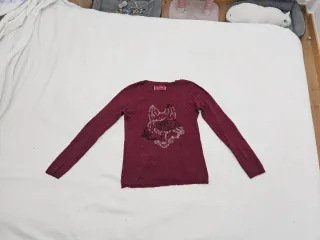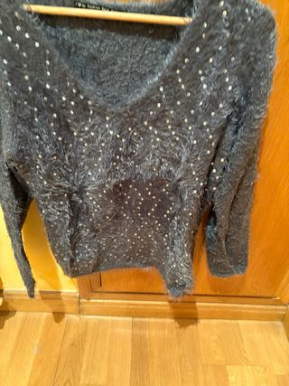 Jersey de punto fino con un diseño de lobo en la parte delantera. Falta alguna piedra pero ni se nota. Medidas: Largo 58 cm. Axilas 42 cm. Bajo 41 cm. Manga 61/46 cm. - Detalle de lobo con pedrería y lentejuelas. - Manga larga y cuello redondo.
