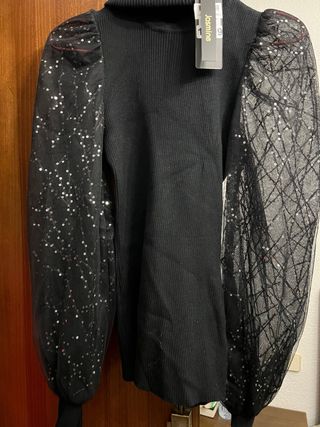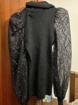 Jersey de cuello alto con mangas abullonadas de tul y lentejuelas. - Mangas transparentes con detalle de lentejuelas. - Puños y cuello de canalé. - Diseño elegante y llamativo.