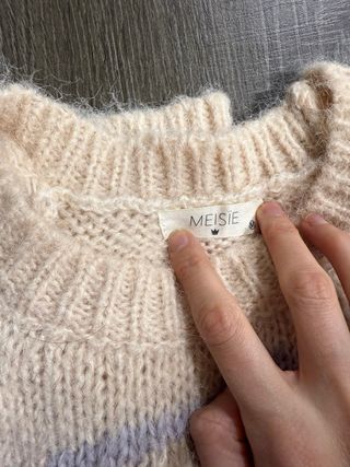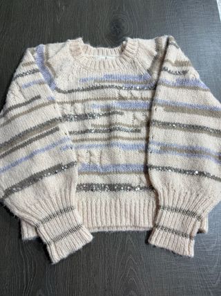Jersey de punto fino con cuello alto y manga larga. Presenta un diseño de rayas horizontales en tonos grises, azules y marrones, con un detalle llamativo de lentejuelas plateadas en la parte delantera. - Cuello alto acanalado. - Manga larga. - Diseño a rayas. - Lentejuelas plateadas. Está nuevo sin estrenar, precio original 40€