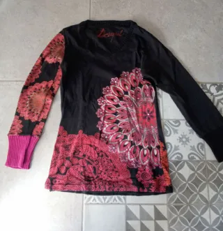 Jersey de manga larga con un diseño vibrante y llamativo. Usado pero en muy buen estado. Hago envíos. - Cuello en pico. - Estampado floral y paisley en tonos rosas y fucsia. - Detalles de lentejuelas. - Puños y bajo con acabado acanalado.