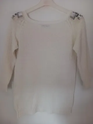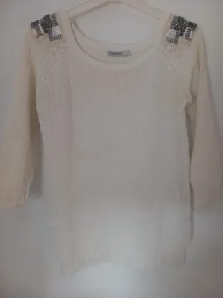 Jersey de punto fino en color blanco, con un diseño original en los hombros. - Detalle de abalorios y lentejuelas en los hombros. - Manga larga. - Cuello redondo.