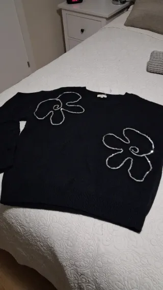 Jersey de punto fino con un bonito estampado de flores y detalles de lentejuelas. El cuello es en pico y las mangas son largas. *Talla Única* - Diseño floral con lentejuelas. - Cuello en pico. - Manga larga.