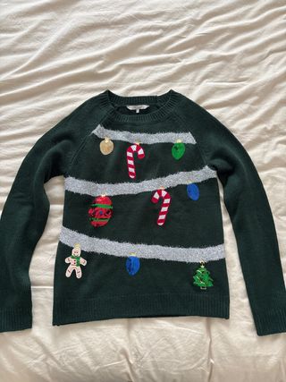 Jersey de punto verde con un divertido diseño navideño. - Adornos de caramelos, bolas y árbol de Navidad. - Detalles brillantes y de lentejuelas.