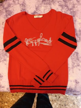 Jersey manga larga color rojo con rayas azules con lentejuelas. tallaje pequeño. es como una talla m o s española. .