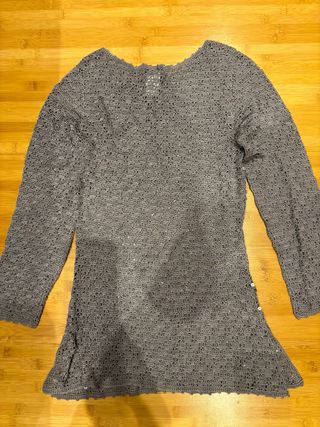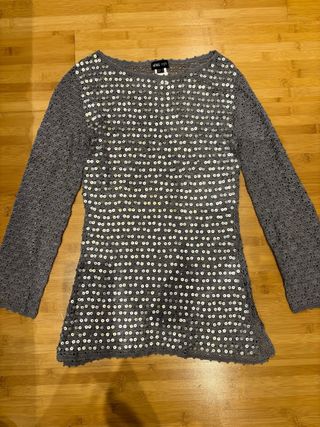 Jersei gris largo plateado con lentejuelas. Tiene una pequeña apertura en la parte frontal con una tela gris semi transparente por debajo. Queda muy bien puesto. En perfecto estado. Talla L de Zara.