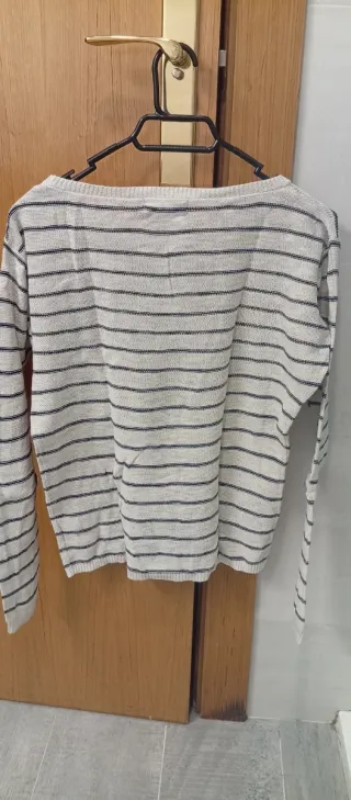 Jersey MANGO color beige y azul marino. Las rallas azules llevan lentejuelas. Talla L. De punto com mucha caida.