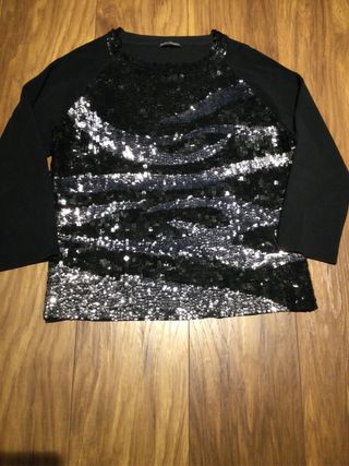 Bonito conjunto de jersey , tejido muy finito , con un trozo de la manga de lentejuelas, y camiseta a conjunto con lentejuelas en los hombros. La camiseta esta usada una sola vez.