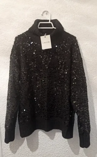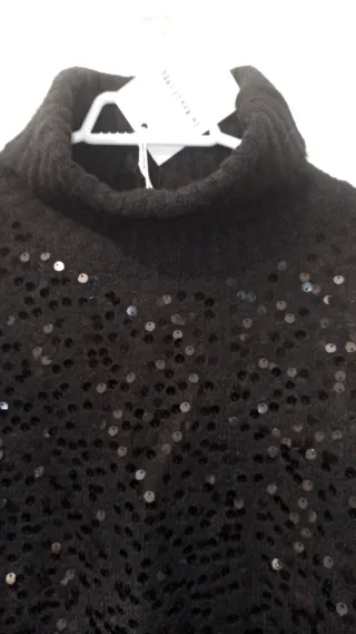 Elegante jersey negro con lentejuelas brillantes. Un básico con un toque festivo, ideal para estás Fiestas ó cualquier otro evento. Un "must have", ideal como fondo de armario. - Diseño con cuello alto. - Género muy agradable al tacto. - Manga larga. - Acabado con lentejuelas por toda la prenda. ⚠️ NUEVO, SIN ESTRENAR. CONSERVA SU ETIQUETA.