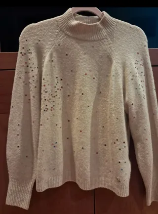 Jersey de punto blanco con lentejuelas al tono, manga larga tipo murciélago, medidas en las fotos. Nuevo con etiqueta