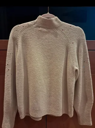 Jersey de punto fino en color beige, con un tacto suave y detalles de lentejuelas multicolores repartidas por toda la prenda. Cuello alto y manga larga. - Lentejuelas de colores variados. - Cuello alto acanalado. - Puños y bajo acanalados. ENVÍOS POR INSPOST O GLS.POR CORREOS, CANCELARÍA PEDIDO.GRACIAS
