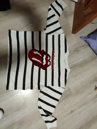 Jersey de manga larga con diseño de rayas blancas y negras. Presenta un llamativo estampado de labios rojos con lentejuelas. - Diseño de rayas verticales y horizontales en mangas. - Detalle de lentejuelas en el estampado.