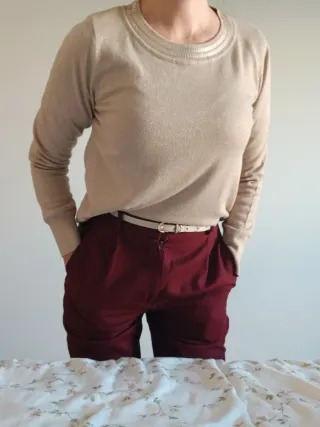 Jersey de punto fino con un toque brillante. Es muy cómodo y versátil. - Cuello redondo con apliques de lentejuelas. - Manga larga. - Acabado metalizado sutil con hilos doradls