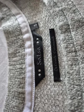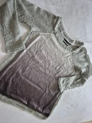 Jersey de punto fino en color gris, con un diseño adornado con lentejuelas plateadas. - Detalle de lentejuelas distribuidas por la parte delantera. - Tejido suave y ligero. - Jersey usado pero en buenas condiciones medidas de sisa a sisa 74 cadera 84 largo 70
