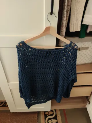 Jersey de Massimo Dutti con un diseño calado y cuello alto. - Tejido 100 % algodón, suave y agradable. - Manga larga. - Estilo moderno y elegante. - Color azul - Talla L Impecable, apenas utilizado