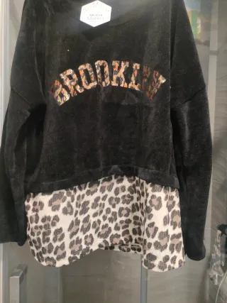 Jersey de mujer con un diseño moderno y llamativo. - Parte superior negra con detalle Brooklyn en estampado animal. - Parte inferior con estampado de leopardo. - Tejido suave y confortable.