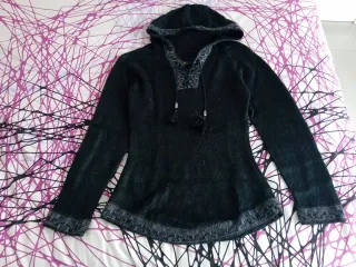 Sueter negro, de alpaca con capucha. En el cuello lleva cordones. Color: Negro y gris. Talla: 36/38 Material: 100% Alpaca Fina (Perú). Tejido parrillo. La última foto es de Google, un ejemplo de como quedaría...