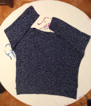 Jersey de punto fino con un toque brillante, perfecto para añadir un detalle especial a tu look. En la etiqueta ponen la talla XL pero es una 40/42. En la última foto está la medida. - Diseño con escote en V. - Tejido con pequeñas lentejuelas dispersas. - Manga larga.