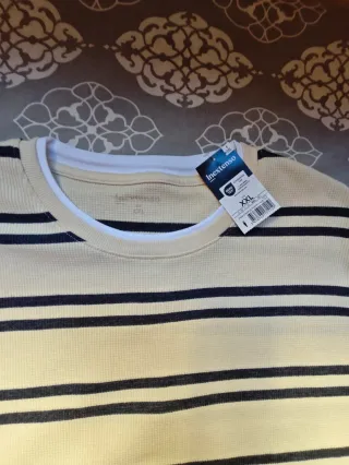 Jersey de manga larga con un diseño de rayas horizontales. - Tejido texturizado. - Cuello redondo. - Detalle de etiqueta en el bajo. En el cuello y en la parte baja lleva una parte blanca como si fuese una camiseta debajo le da un detalle muy chulo. Está completamente nuevo con etiqueta. Talla XXL