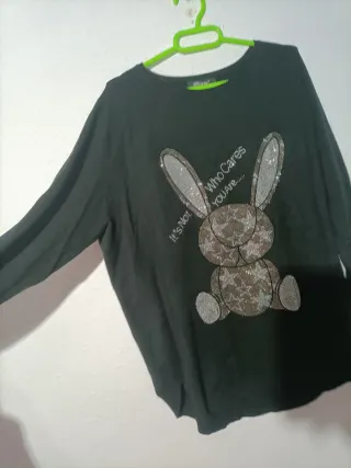 Jersey negro con un llamativo estampado de conejo adornado con brillantes. El diseño incluye texto It's Not Who Cares YOU Are..... - Estampado de conejo con detalles de estrellas y brillantes. - Cuello redondo y mangas largas No me desplazo entrego en mano zona Carolinas altas no envío solo pago en efectivo no bizum3.