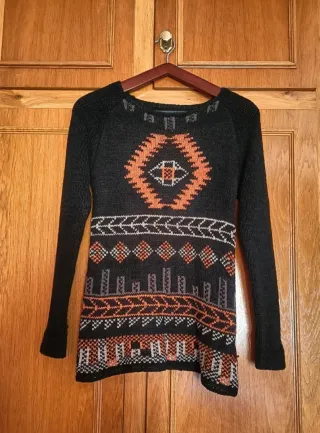 Jersey original Desigual, talla L, en muy buen estado. Fondo negro con un diseño geométrico tribal en tonos naranja, blanco y gris en la parte delantera, muy llamativo y característico de la marca. En la parte superior de la espalda lleva el logo Desigual bordado en naranja. Tejido de punto grueso, cálido y cómodo, ideal para otoño e invierno. Estilo urbano, alternativo y boho. Prenda cuidada, sin desgaste